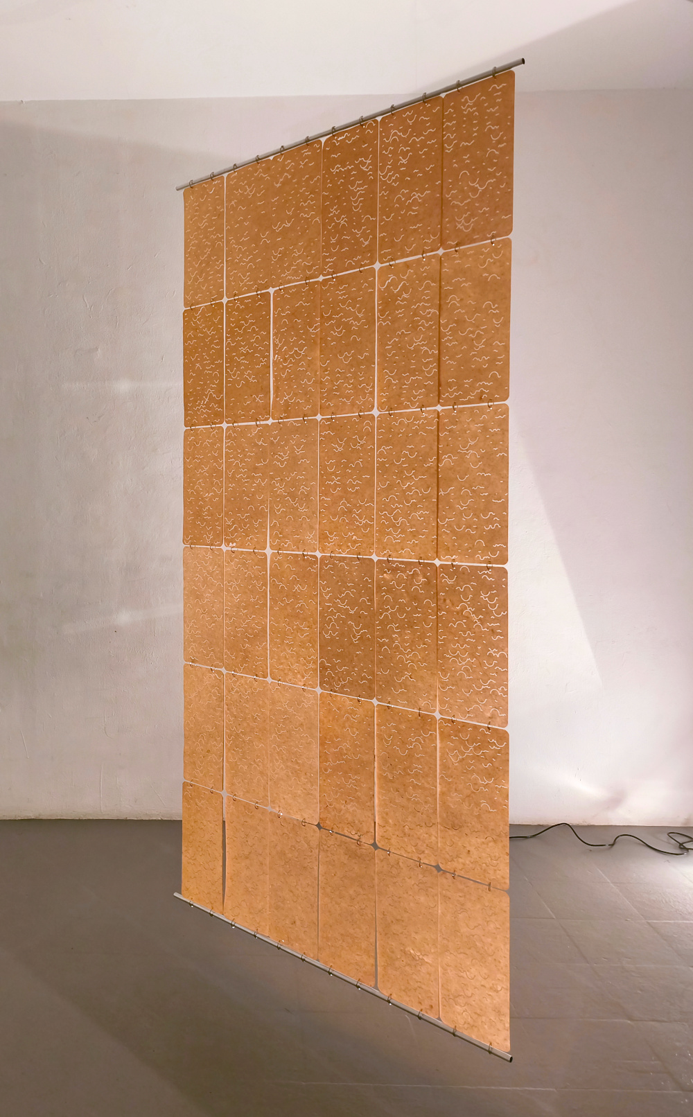 Series of three panels of ring binded laser-cut cards. Handmade Indian paper made from recycled cotton pulp dyed with tea, recycled kraft paper and handmade cotton paper from Annigoni in Italy,
