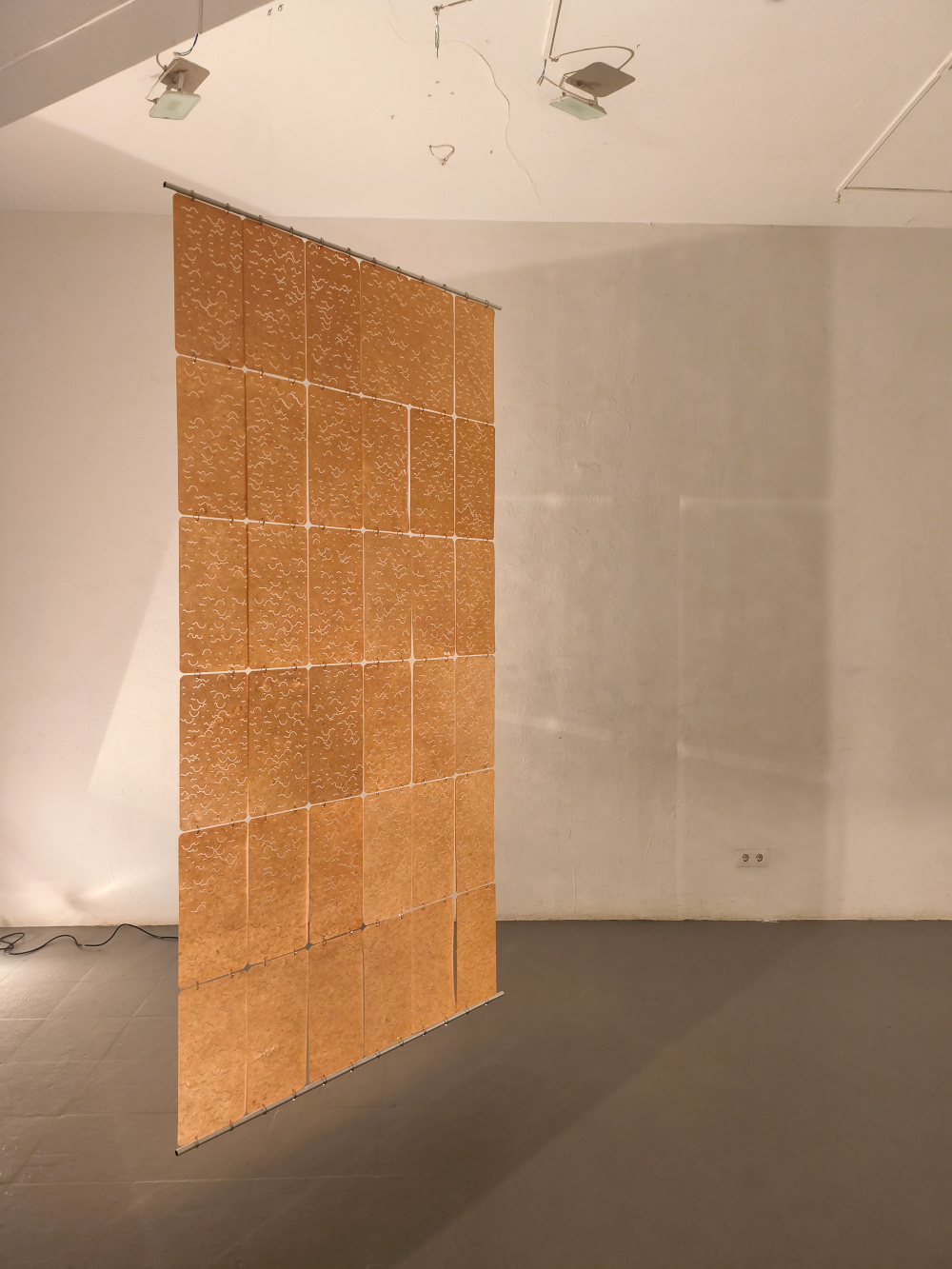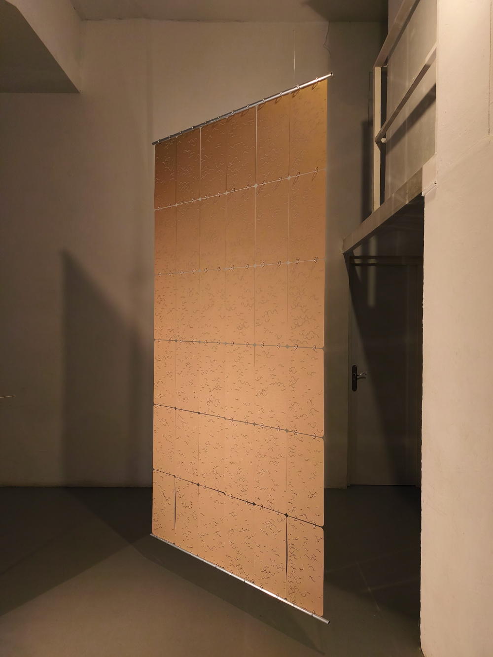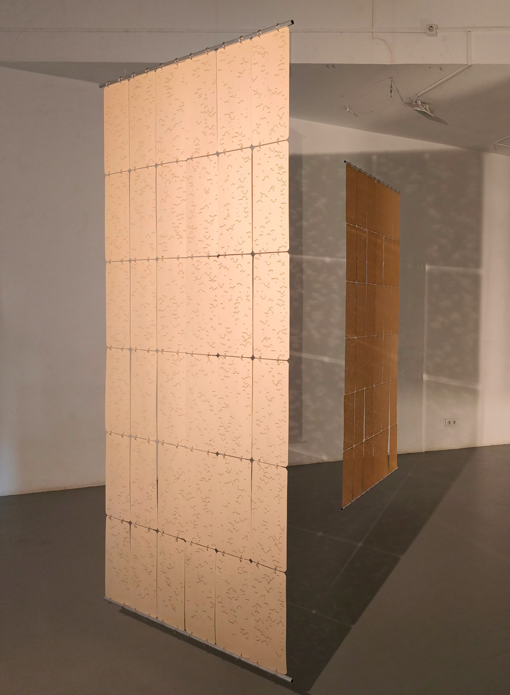 The first panel contains excerpts from the Hittite divination texts CTH 513 and 564 (14th–13th centuries BCE), originally written on clay tablets in cuneiform script. These records accurately describe the movements of different birds, as if they were readings produced by a primitive sensor system. The panel is made of recycled kraft paper, whose materiality refers to ‘mud paper,’ evoking the original medium of the writing.