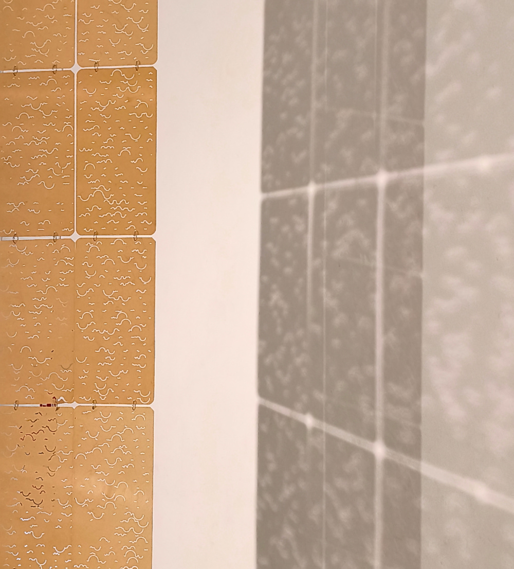 The three texts have been transcribed onto the panels using an original typographic system designed specifically for the work. This alphabet is based on the EURING scientific bird ringing standard, which defines 19 types of rings according to size and species. Each type of ring corresponds to a letter of a Latin alphabet reduced to 19 characters, assigned according to frequency of use in the language of the translation: the least frequent letters are linked to larger rings.