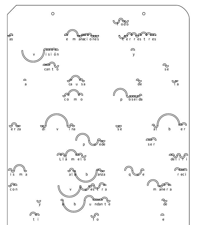 Para dotar de fluidez visual a la escritura, cada carácter se representa mediante media anilla, dispuesta como montaña o como valle según las necesidades de legibilidad. Así, el texto se convierte en una partitura gráfica con ecos tanto al movimiento como al canto de las aves.