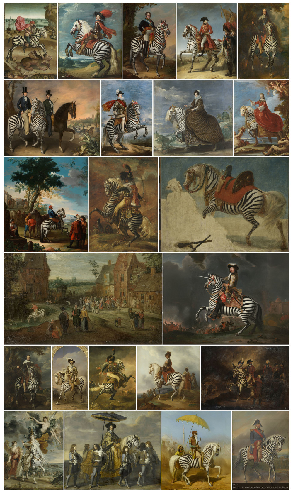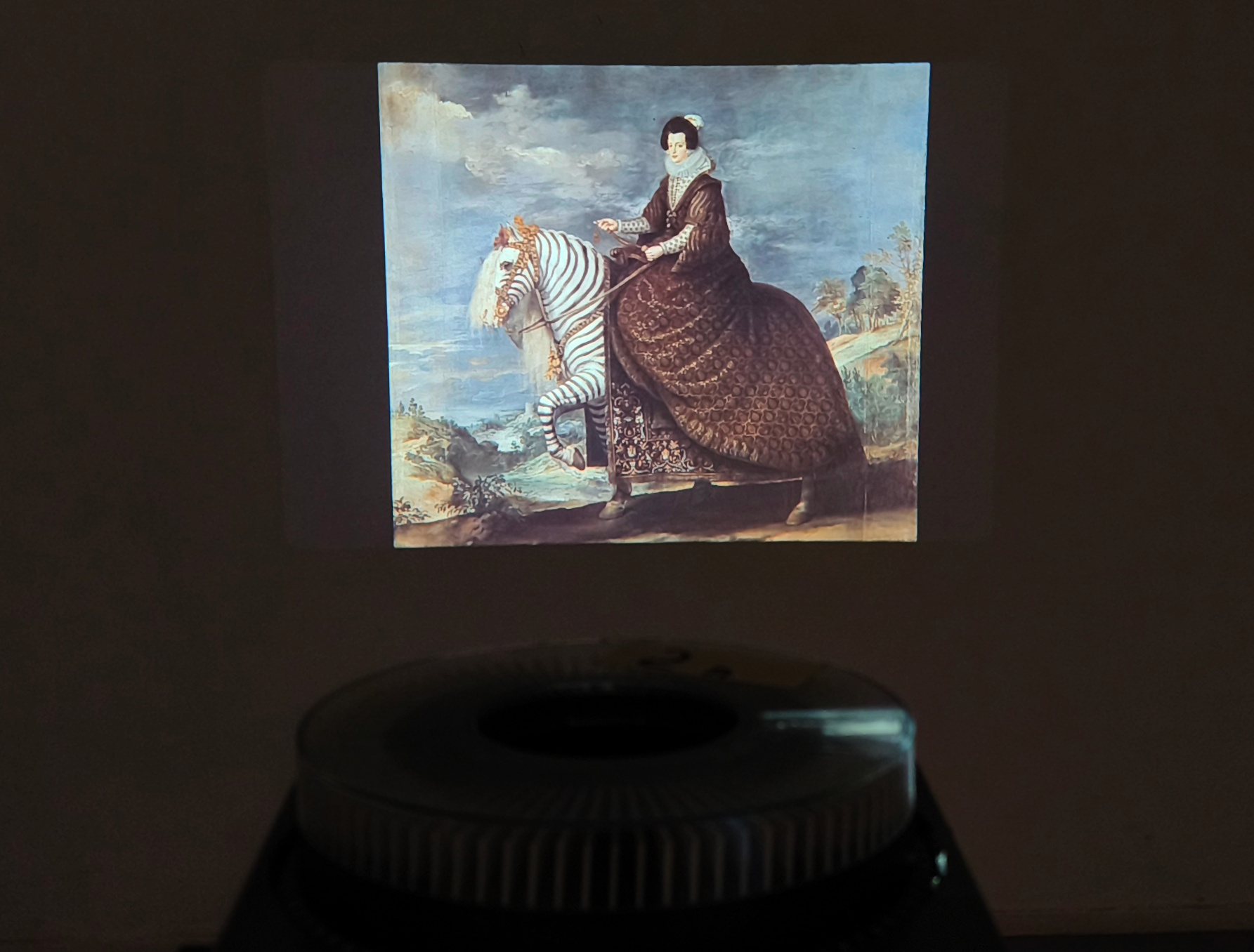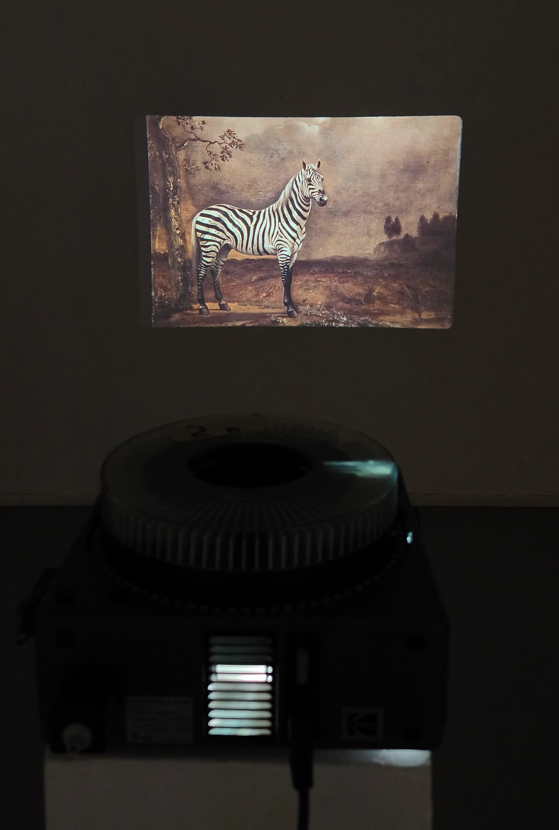 The Turing Horse is an archive presented as a slide carousel composed of reproductions of works from major international art galleries featuring a white horse. Using image generation techniques, these equestrian portraits, landscapes and genre scenes are intervened by incorporating the characteristic stripes of zebras into the horses.